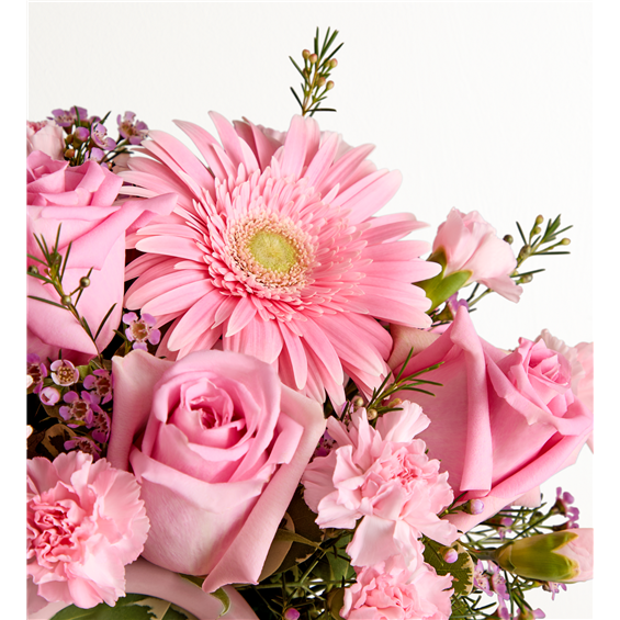 The ultimate arrangement for your favorite fashionista. Roses, Gerbera daisies, and other blooms in delicate shades of pink pop out from the top of our keepsake handbag-shape vase, making this a truly chic gift.